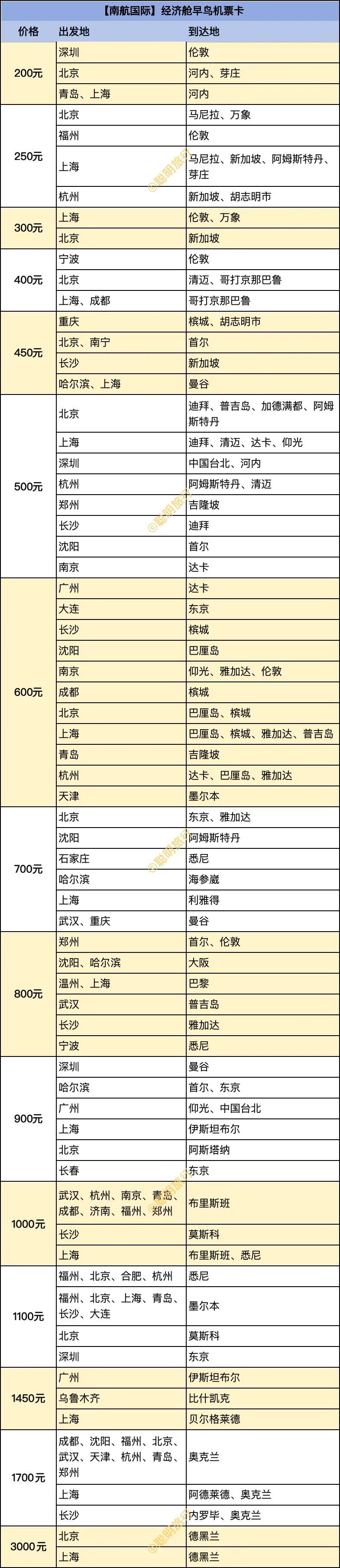南航 国际 单程经济舱早鸟 不含税200元起