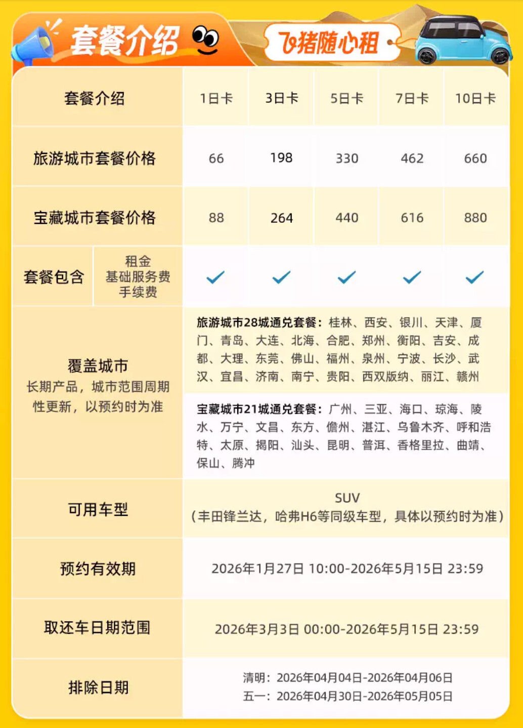 1/2/5/7/10/30日套餐,价格分别为88元、176元、440元、616元、880元、2640元,包含基础服务费及手续费。覆盖广州、三亚、海口、乌鲁木齐、昆明等热门旅游城市,车型为经济型轿车(如大众朗逸)。