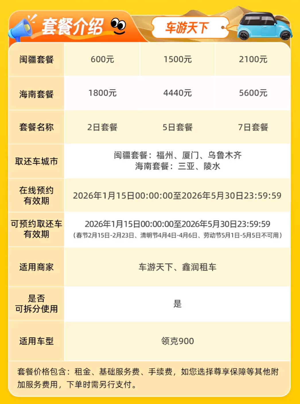 300元租领克900,分闽疆(福州、厦门、乌鲁木齐)和海南(三亚、陵水)两档,可选2日、5日、7日卡,价格分别为600元/1500元/2100元(闽疆)和1800元/4440元/5600元(海南),包含租金、基础服务费及手续费。
