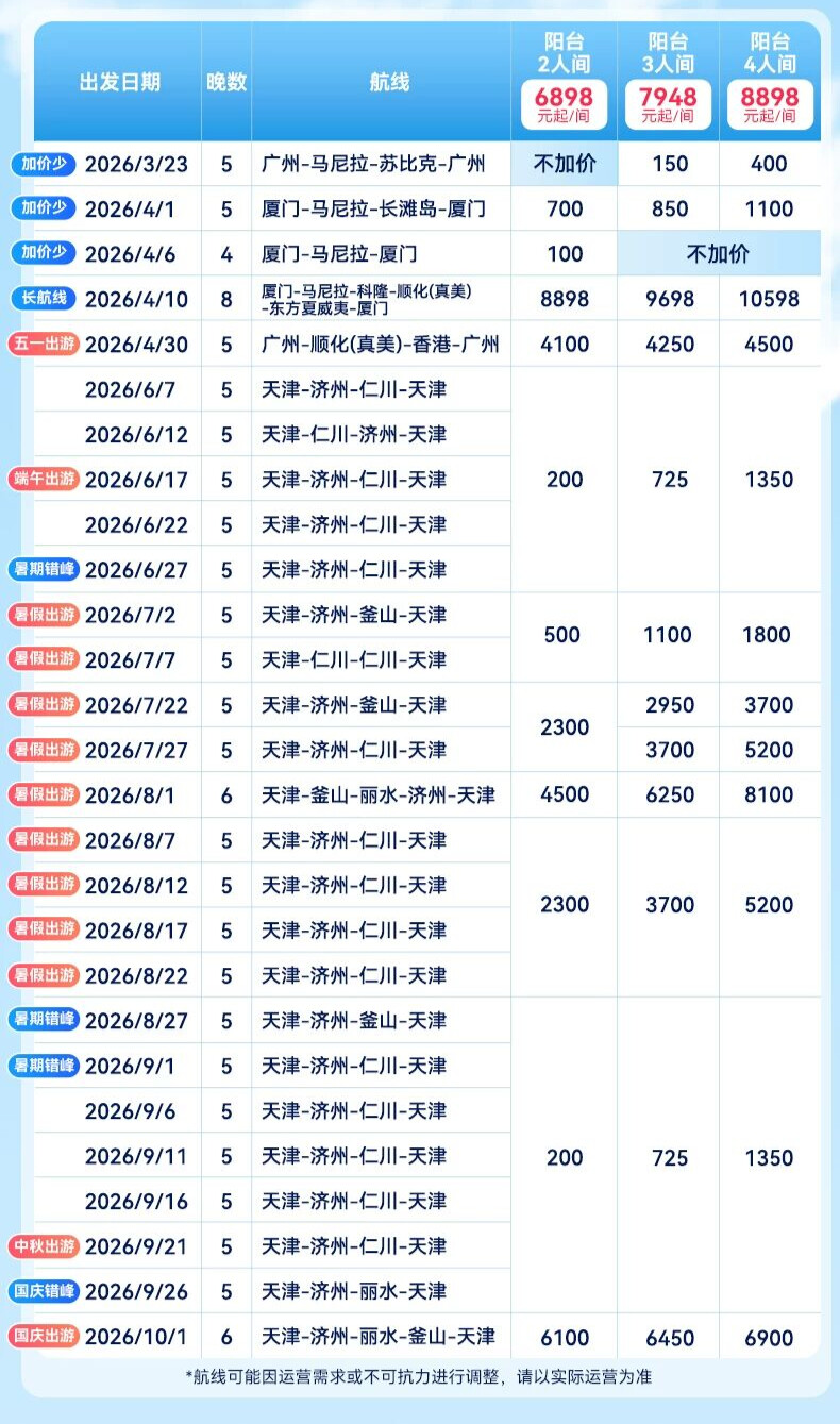 那么把需求都集中在8月旺季,导致航次少,船票自然不愁卖,等到临近暑期必然大涨,所以现在的早鸟促销是真的划算,特别是带娃家庭,阳台房直接免掉2个儿童免的船票!