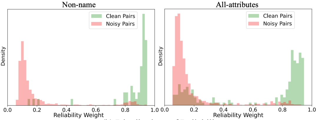 根据图 3-4,提出的可靠度量化策略不仅能够有效区分跨图谱的正确关联和噪声关联,而且能够识别出不可靠的属性,从而促进鲁棒跨图谱对齐和多属性融合。此外,根据图 5,测试时关联推理模块能够有效挖掘出图像属性之间的潜在关联,从而提升实体对齐的准确率。