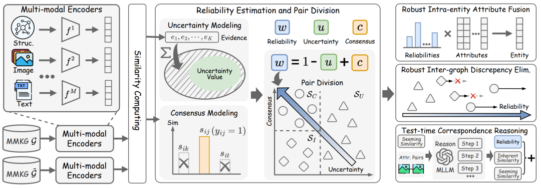 本文设计了一系列方法来缓解噪声关联和潜隐关联对多模态实体对齐模型的负面影响。具体而言,团队首先提出了统一的准则来量化实体内和跨图谱关联的可靠度,在训练时采用鲁棒的多属性融合和跨图谱对齐策略来缓解噪声关联的负面影响,在测试时使用了关联推理模块来挖掘潜隐关联,最终实现更准确的实体对齐。