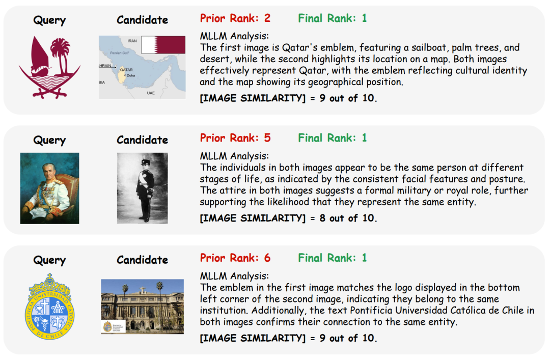 为了挖掘看似不同但本质相同的属性,团队提出了测试时关联推理模块,利用多模态大模型(MLLM)的内蕴知识来矫正属性 - 属性关联,进而提升跨图谱实体对齐的准确率。具体而言,MLLM 推理得到的对齐结果如下:
