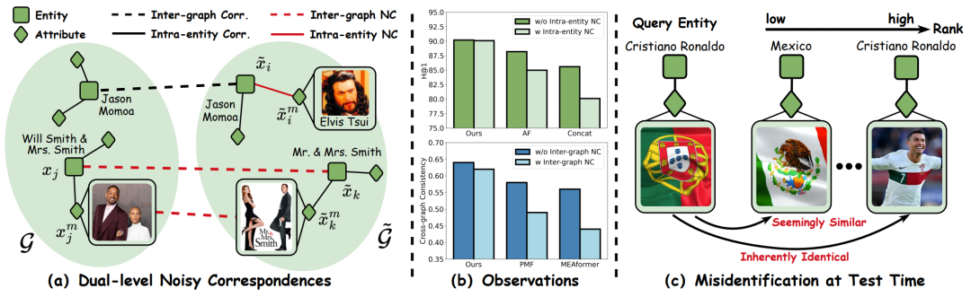 然而,现有方法通常假设实体内和跨图谱的关联都是正确的,忽略了知识图谱中广泛存在的噪声关联问题。据统计,部分基准测试中有超过 50% 的实体受噪声关联问题影响。如图 1 (b) 所示,噪声关联不仅会破坏实体内的属性融合,还会误导跨图谱对齐过程,这两方面因素都将导致模型性能显著下降。