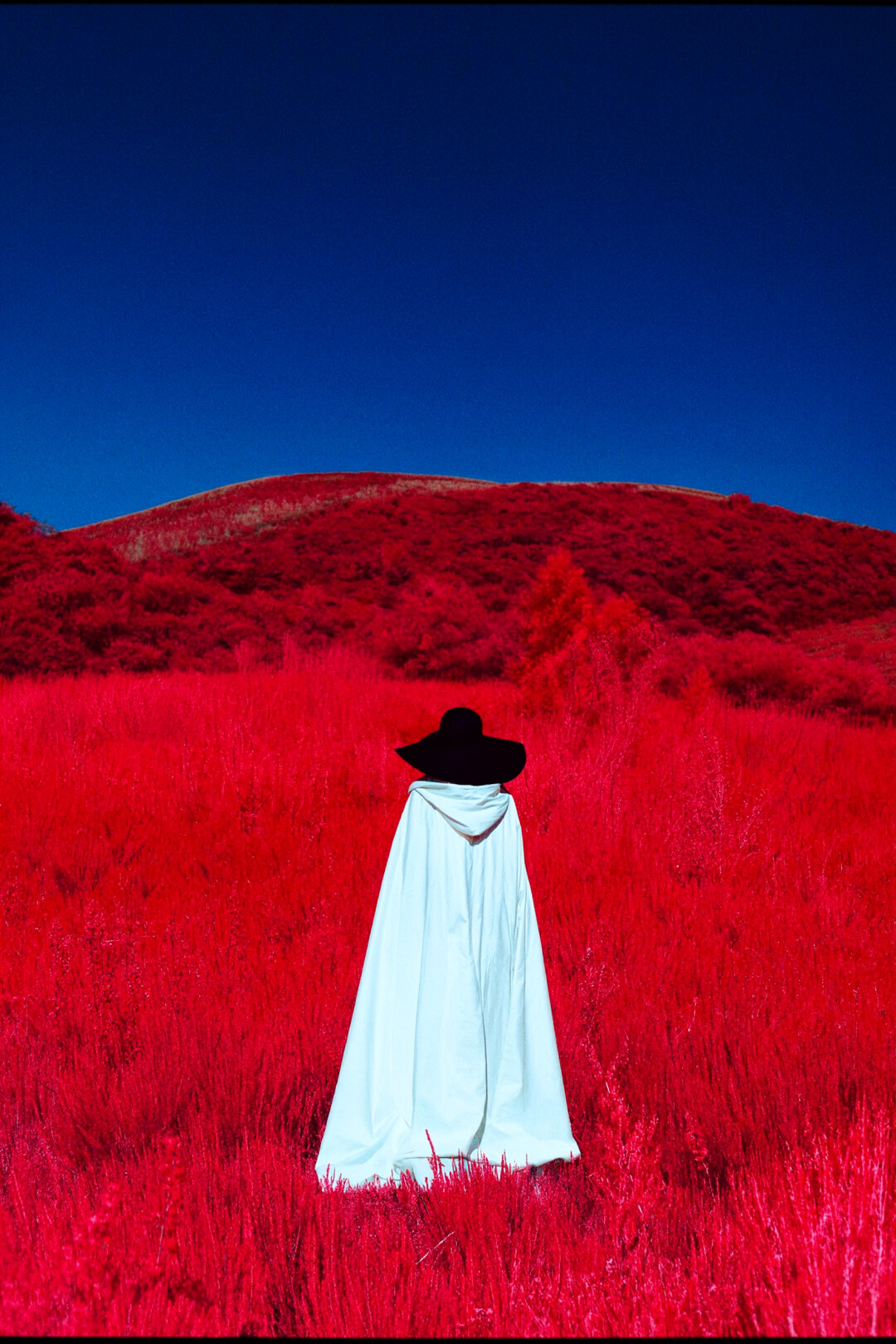 Prompt:Figure seen from behind wearing a flowing white cloak and wide-brimmed black hat standing in a vast field of tall vivid red grass, rolling hill stretching to the horizon, deep saturated blue sky with no clouds, strong color contrast between red field white fabric and blue sky, shot on medium format film, infrared photography aesthetic, high fashion editorial feel, sharp shadows, portrait orientation