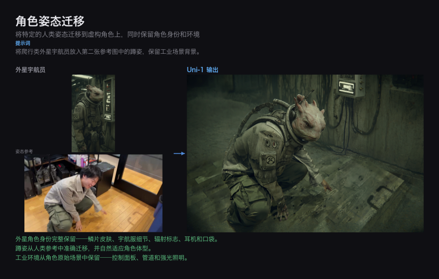 参考图中一名男子在电梯间的半蹲姿势被迁移至一个穿宇航服的拟人化老鼠角色上,场景被重构为工业风格背景。Uni-1 在保持角色完整身份的同时 —— 鳞片状外衣、宇航服细节、耳机和口袋设计 —— 准确还原了参考姿态的关节角度和重心分布,体现了对人体动力学和角色设计语义的双重理解。
