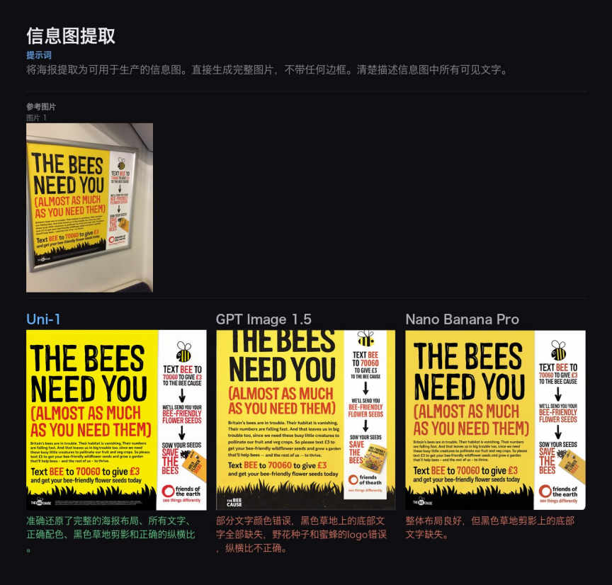 该任务同时考验模型的视觉理解能力(准确提取海报中的文字和版式信息)和生成能力(重新组织为清晰的信息图)。Uni-1 准确还原了文字内容、保持了正确的层级结构。而 GPT Image 1.5 混淆了文字层级,部分文字难以辨认;Nano Banana Pro 则未能完整呈现信息图的内容。