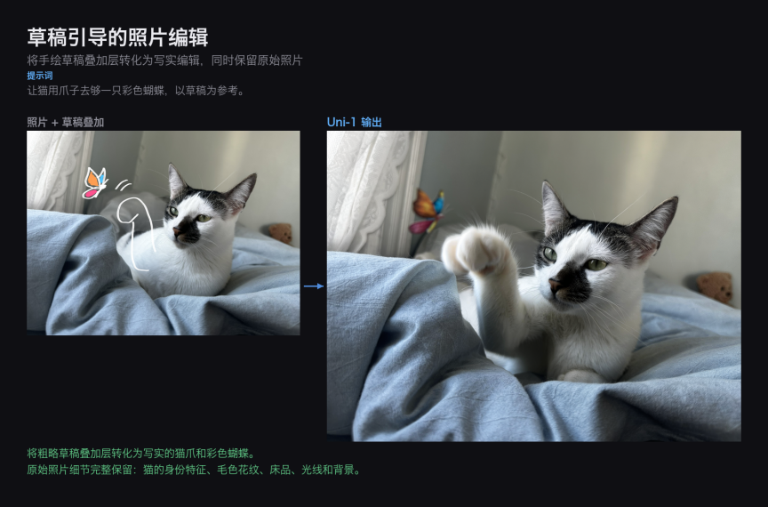 Uni-1 将草稿的叠加转化为写实的照片编辑,保持了原始照片的细节完整性:猫的身份信息(毛色花纹、耳部形态)、环境(光线和背景)均未受影响,新增的蝴蝶自然融入了场景。