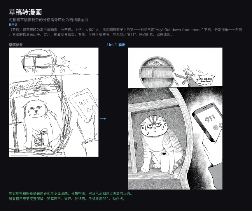 Uni-1 将草稿的分镜结构、人物动态和对话气泡位置完整地转化为专业漫画画面。所有细部信息均被保留并精细化:猫耳朵的弧度、卷烟缸的位置、书架上的书本排列,以及手机屏幕上显示的「911」文字,体现了模型对草稿语义的深层理解。