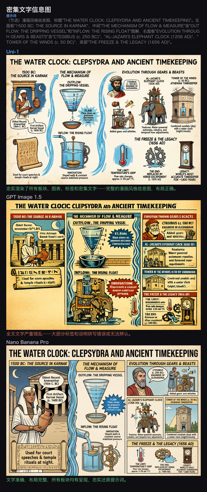Prompt:生成一张关于{水钟(Clepsydra)与古代计时}的密集文字信息图,包含多个知识板块和精细插图。