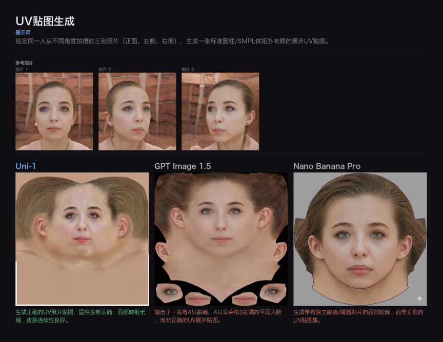UV 贴图生成是 3D 建模工作流中的关键环节。Uni-1 生成的 UV 贴图在面部特征对齐、左右对称性和肤色一致性方面均优于对比模型。GPT Image 1.5 遭遇了正脸和侧面贴图的不一致问题,而 Nano Banana Pro 则未能生成符合标准 UV 布局规范的结果。