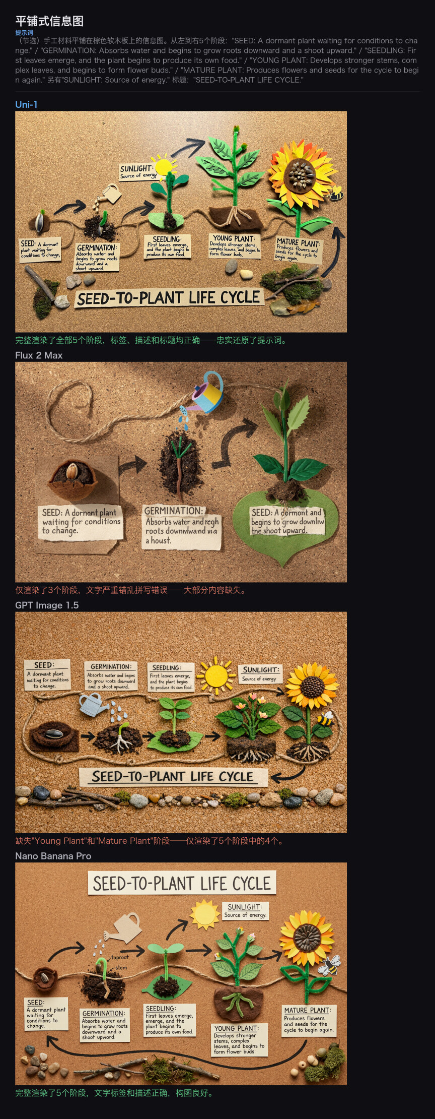 Uni-1 准确呈现了完整的生命周期阶段,每个阶段的插图和标注文字清晰可辨。值得注意的是,Uni-1 在处理「Young Plant」到「Mature Plant」的过渡阶段时,正确呈现了植物形态的渐变关系,展现了对生物学常识的理解。