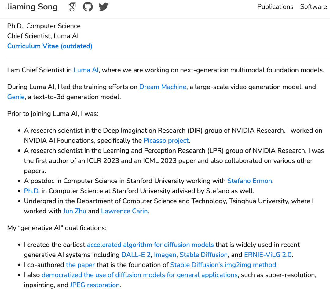 他最广为人知的工作是发明了 DDIM—— 一种大幅加速扩散模型采样速度的算法,如今已被 Stable Diffusion、DALL・E 等主流图像生成系统广泛采用。
