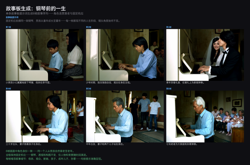 6 帧画面中角色的身份特征保持一致 —— 面部结构、肤色在不同年龄阶段平滑演变,同时钢琴、透视和画面风格保持稳定。从第 1 帧的小男孩到第 6 帧的大家庭合照,全程维持了叙事连贯性和时间逻辑。这种跨帧的长程角色一致性和时间推理能力,是当前图像模型面临的核心挑战之一。