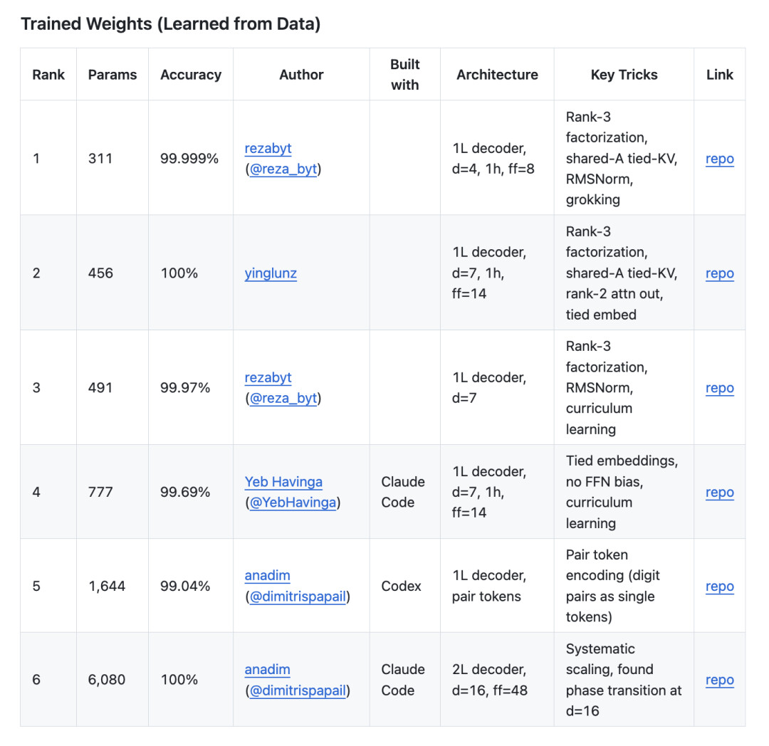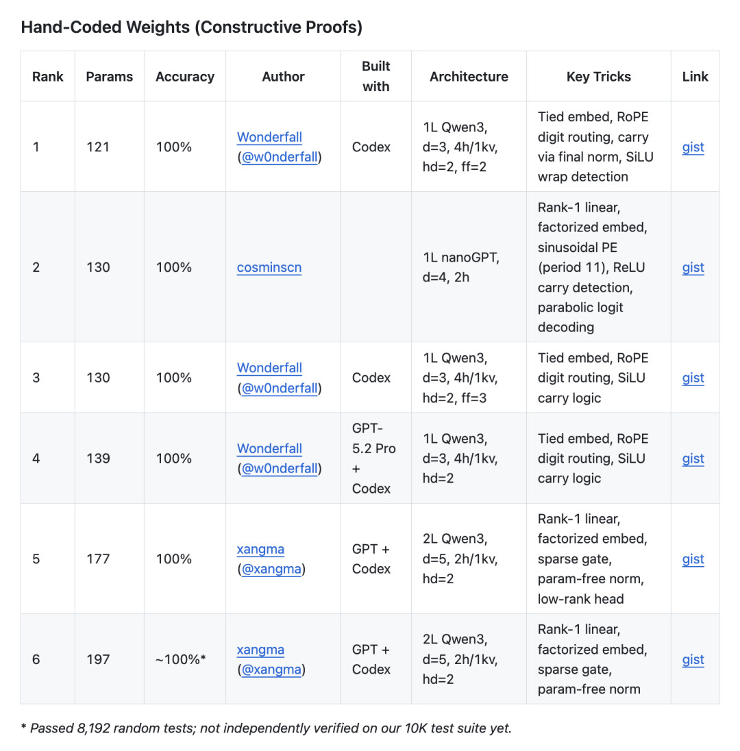 这两种由 AI 智能体展现出的截然不同的架构审美,直接引爆了开源社区。Dimitris 随即在 GitHub 开启了 AdderBoard 挑战。