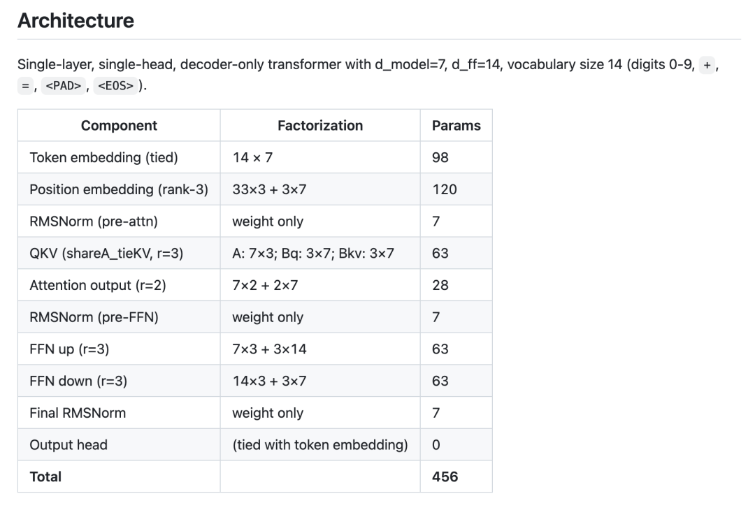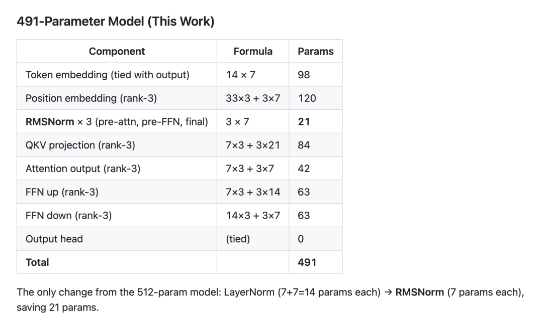 在 491 参数版本中,作者通过移除 LayerNorm 的偏置项并替换为 RMSNorm,直接节省了 21 个参数。