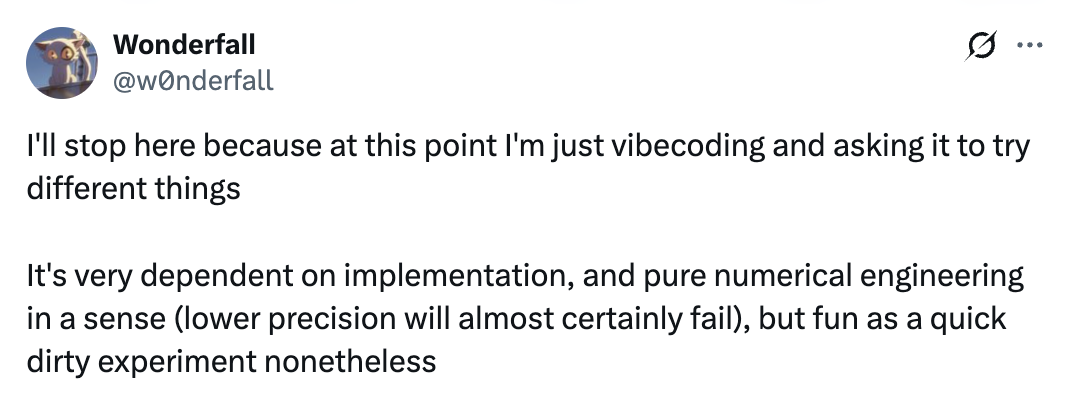 @Wonderfall 随后将记录刷新至 121 参数。他最初基于常规 Qwen3 架构构造了 139 参数版本,接着通过压缩网络宽度,将前馈层中间维度降至 3,挤出 130 参数版本。