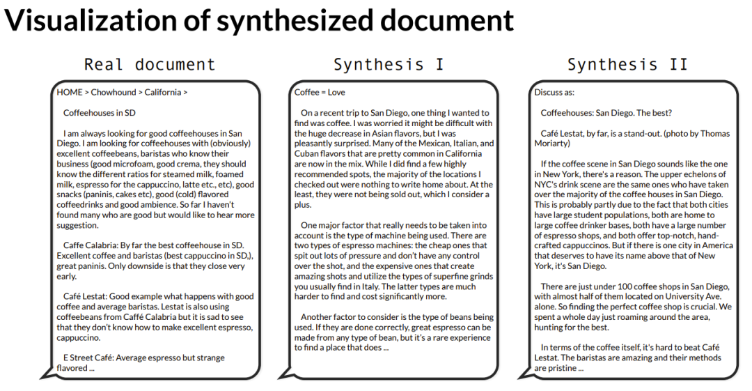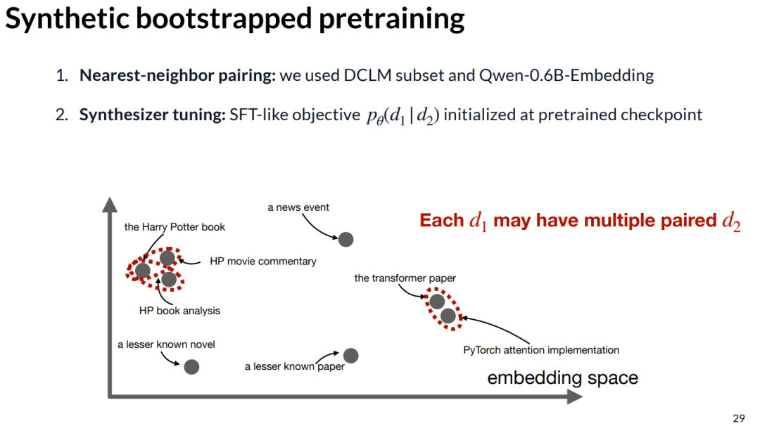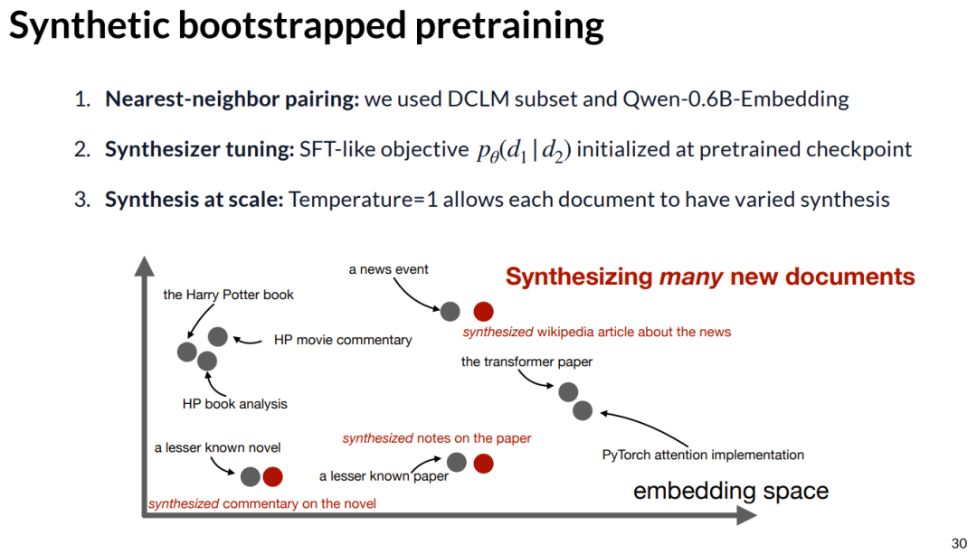 而右侧的合成文档,内容开始像是在讲述一趟圣地亚哥之旅,然后它开始把焦点转向浓缩咖啡机,而浓缩咖啡机并非源文档关注的内容。也就是说,模型完全自主地想出了这个主意,这也展示了合成内容的多样性。我们还有另一篇不同的合成文章,试图将圣地亚哥的咖啡馆与纽约进行对比,而「纽约」这个词根本没有在真实文档中出现过。这就是为了让大家体会一下这种生成过程会呈现出什么样的感觉。在我们准备好所有这些真实数据和合成数据之后,我们将用它们混合在一起来进行训练。