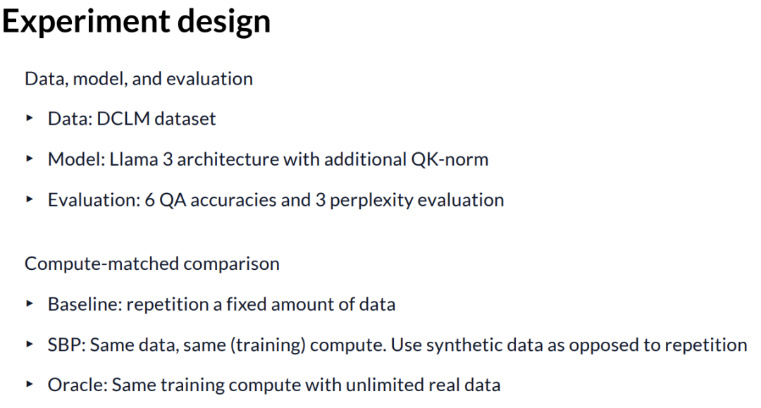 关于数据我们之前已经讨论过了;在架构方面,我们使用了 Llama 3 的架构,并额外加上了 QK LayerNorm,我们发现这有助于稳定训练过程;在评估方面,我们采用了六项问答准确率、 Few-shot 问答准确率以及三项困惑度评估,这些都是常用于预训练阶段的指标。在这个设置下,我们进行了计算量匹配的对比:我们的基准是通过简单的重复来复用固定数量的数据。这非常直接明了。对于合成引导预训练,我们以基准为参考,控制了两个变量。