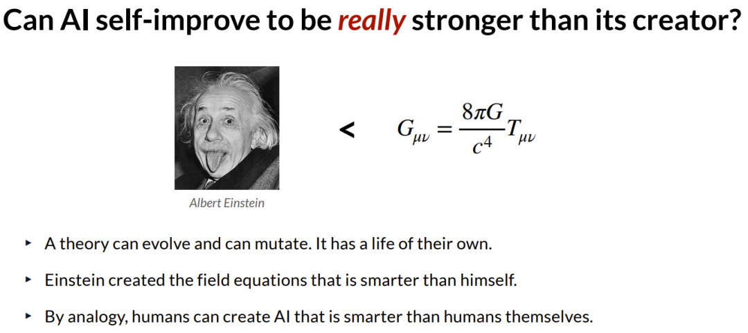 Zitong Yang 在总结中指出,正如爱因斯坦创造的场方程能够预言连其本人最初都无法接受的宇宙膨胀一样,人类基于算法过程所创造出的智能体,也完全拥有进化出超越创造者智能水平的必然性。