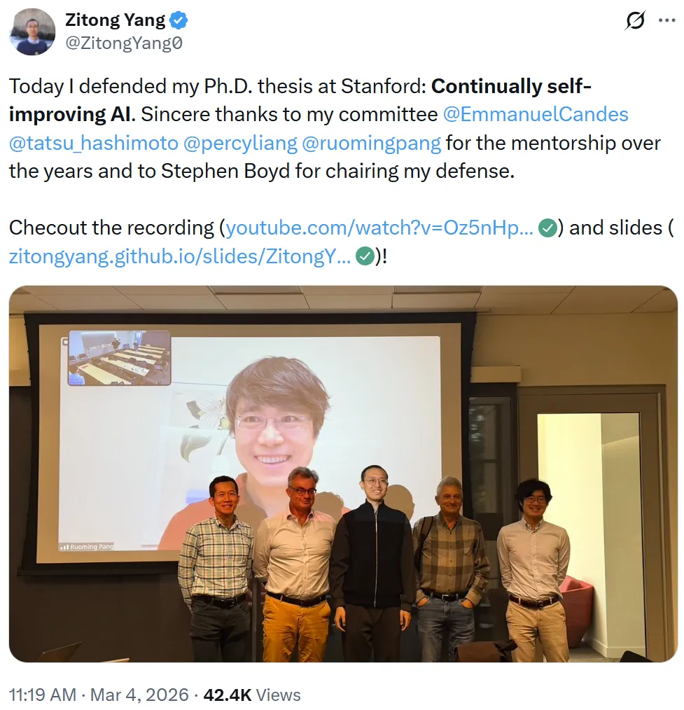 昨天,Thinking Maching Lab 研究者、斯坦福大学博士生 Zitong Yang 正式完成了他的博士论文答辩,课题为「持续自我提升式 AI」(Continually self-improving AI),并且他在答辩完成后很快就放出了自己的答辩视频,从中我们可以看到他对未来 AI 发展路径的系统性探索。针对当前模型在训练后权重静态化、高质量人类数据面临枯竭,以及新算法发现高度依赖人力这三大局限,他提出了明确的解决方案。
