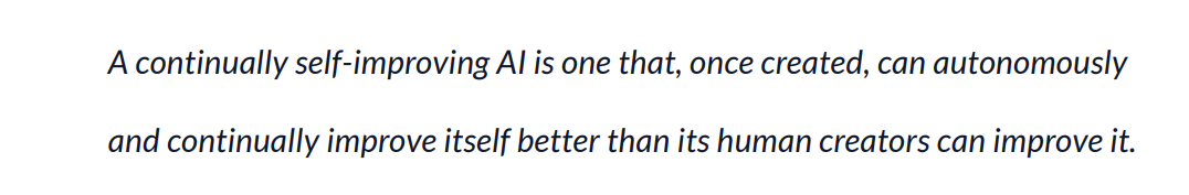 所谓持续自我改进式 AI 系统,是指一旦被创造出来,就能自主且持续地进行自我改进,并且其改进效果要优于人类创造者对它的改进。