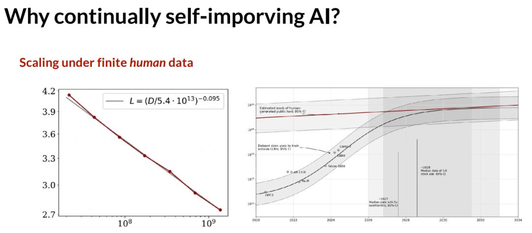 在左边,我们展示了 Scaling Law。X 轴代表语言模型训练的 token 数量,Y 轴代表测试损失。在右边,我们有 Epoch AI 的预测:随着时间的推移,前沿语言模型所使用的 token 数量正迅速逼近互联网上公开可用的 token 总量。当然,人们正试图购买和获取私有领域的数据。但同样的逻辑依然适用,即人类数据是有限的,并且随着我们想要训练越来越深的神经网络,这些数据正在被耗尽。