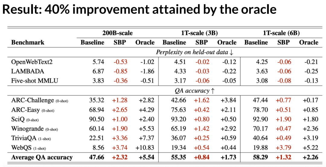 我们看到的关键结论是,如果我们观察问答准确率的平均提升情况,包括 SBPT 和 Oracle 相对于基准的相对提升,在所有这三种情况下,我们都看到了可以由 Oracle 实现的约 30% 的提升,所以这种改进是非常一致的。有趣的是,我们发现在某些基准测试中, 6B 参数、 1 万亿 token 的模型已经几乎像是一个可用的语言模型了,这相当于 Llama 计算量的一半,理应如此,这意味着我们能改进的空间应该更少了。但是,在某些基准测试中,我们实际上在 6B 参数的处理条件下看到了更大的提升。这是因为你的合成数据生成器也变得更强大了。它的幻觉变少了。正是这个观察将我们引向了关于自我改进预训练能力的最后一张结果表。