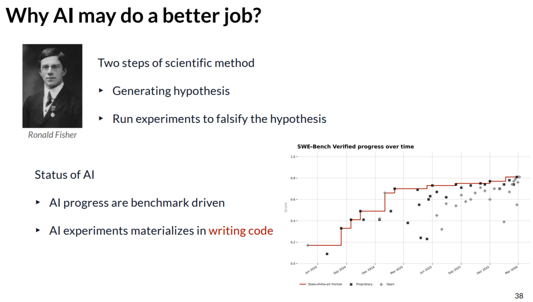 我想追溯到这个科学方法论。Fisher 提出了科学进步的两阶段过程:首先提出假设,在提出假设之后,你需要做两件事:进行实验,然后试图证伪这个假设。这带来了一个非常严谨的科学过程。例如,你可能会说你无法证伪牛顿定律,但你不能理所当然地假设牛顿定律是绝对正确的。后来,我们有了爱因斯坦的理论,那只是因为在当时的实验条件下,你无法证伪牛顿定律而已。这意味着科学的本质就是运行实验和产生想法。