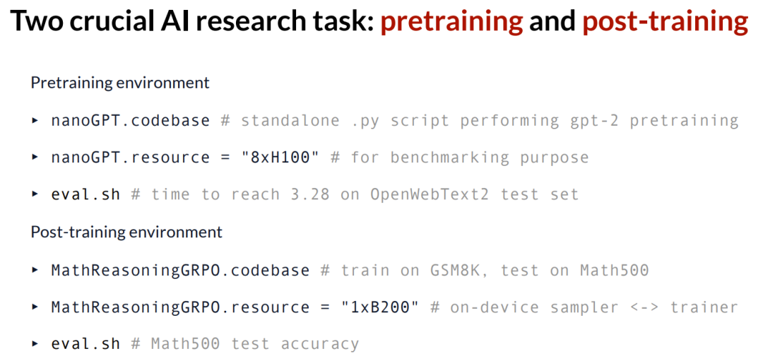 至于后训练环境,我们有这个使用 GRPO 算法进行数学推理的任务。其代码库是在 GSM8K 数据集上进行训练,并在 MATH500 数据集上进行测试。这实际上取自斯坦福 CS336 课程的作业。在资源方面,我们使用了一张单卡 Blackwell GPU,以便在单个设备上实现采样器和训练器底层权重的无缝切换。