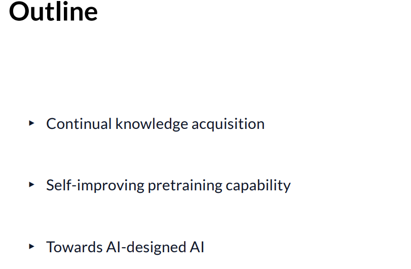 这就解决了我们期望的第一个特性,即我们希望模型在回到人类创造者手中后能够持续获取知识。第二点是,我们希望自我改进模型本身的预训练能力。