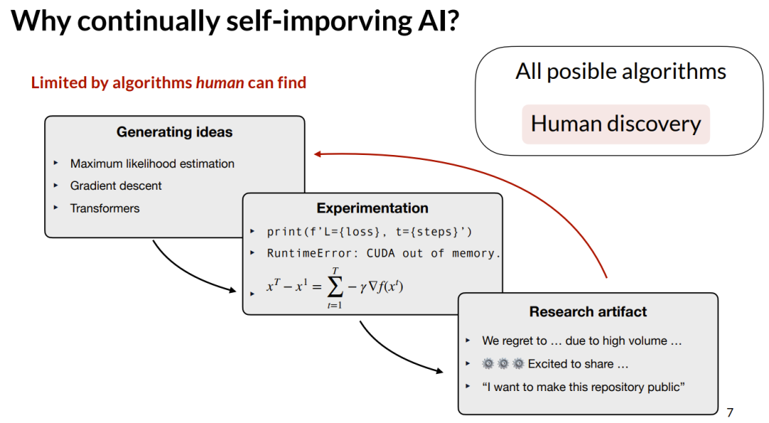 如果我们思考一下人类是如何提出算法的:它经历了一个产生想法的过程(例如最大似然估计),然后进行实验(这可能是编写代码或进行数学推导),最终你得到一些研究成果;随后其他人在此基础上继续研究,这个循环再次开始。这个过程极其依赖人力,并且成本非常高昂。因此,我们发现的仅仅是所有可能算法中的一个子集,而我们希望利用 AI 本身来使这个过程自动化。