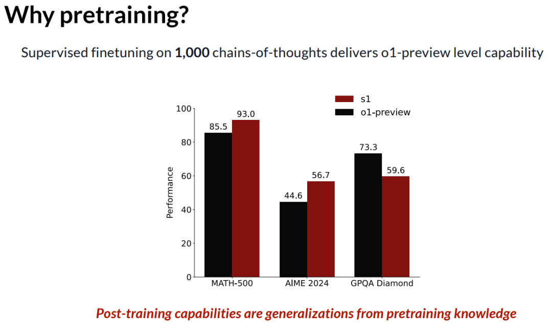 但我们在这篇论文中展示的是,仅仅对 10,000 条思维链数据执行监督微调,就能提供达到 o1-preview 级别的能力。这是 s1 和 o1-preview 之间的对比。这让我意识到,后训练能力就像是对预训练知识的一种极其奇妙的泛化。