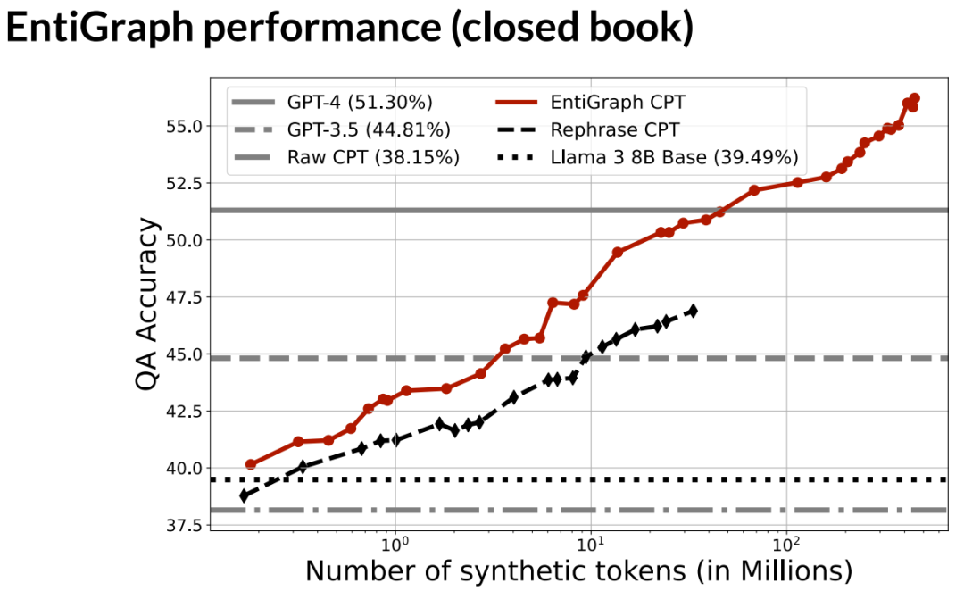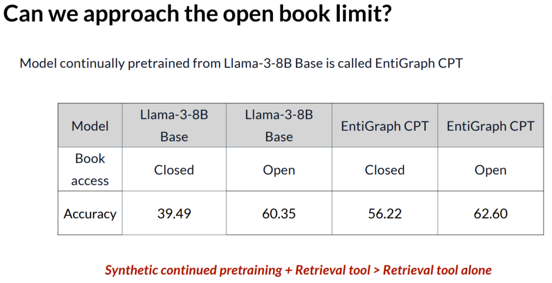 对于实体图方法,在闭卷情况下,我们的准确率大约是 56%,虽然这并没有完全填补与开卷测试的差距,但我们发现,如果你将开卷方法和持续预训练结合起来,实际上能得到最好的结果。这意味着它们的改进是互补的。