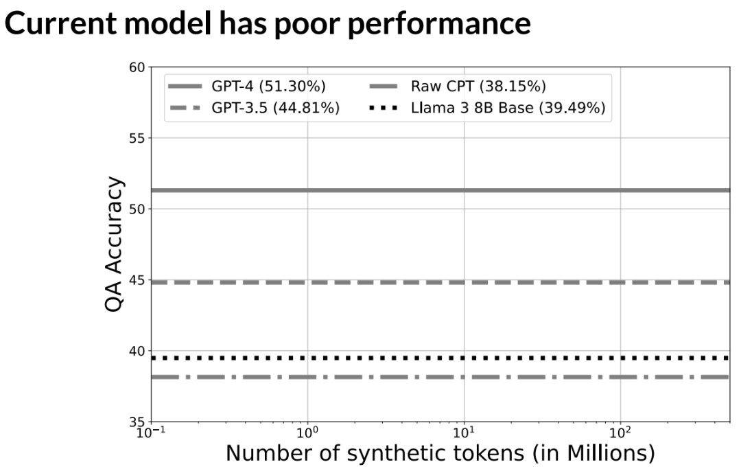 这是四选一的选择题,所以随机瞎蒙的准确率是 25%。我们要微调的模型是 Llama 3 基础模型,它开箱即用的准确率只有 39%。一个顺理成章的做法是直接在原始数据本身上进行微调。我们称之为原始的持续预训练,我们发现准确率实际上略有下降。这是因为 token 的数量实在太少了,除非你进行合理数量的回放(replay),否则你的 batch 设置和学习率规划都没有被正确设定。此外,我们还有两个来自闭源模型的静态参考, GPT-3.5 和 GPT-4,我们看到它们的准确率分别在 44% 和 45% 左右,所以这是一个模型拥有一定相关知识的基准测试,它不是完全随机的,但也绝对达不到 60% 之类的水平。