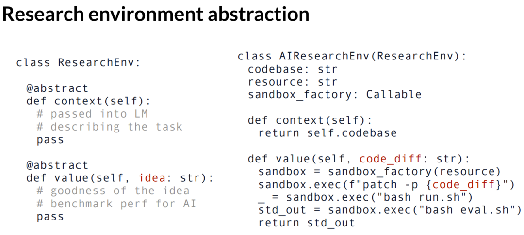为了使模型能够做到这一点,我将引入「研究环境」的概念。它提供了一个简洁的抽象,告诉你进行 AI 实验需要什么。我们先从一个更通用的研究环境开始。