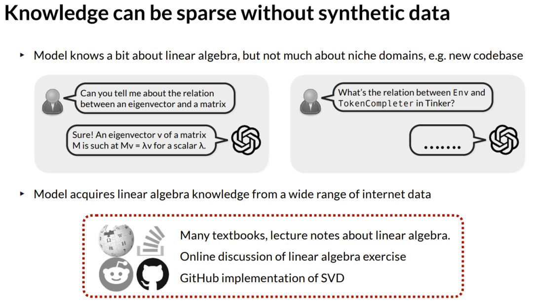 如果我们对比模型对线性代数的知识,与对 GitHub 上新发布的一个代码库的了解程度,模型对线性代数有着极其完美的记忆和深入的理解;但如果你问它关于这个新代码库的问题,比如抽象和 token 计算机之间的关系是什么,模型可能甚至不理解这个问题在问什么。通过这种对比我们发现,模型从各种各样的互联网数据中获取线性代数知识,这些数据包括许多教科书、讲义、关于线性代数习题的在线讨论,甚至包括 GitHub 上奇异值分解的代码实现,而对于新发布的代码库来说,这种多样化的表征根本不存在。这就是我们为什么需要合成数据的原因。
