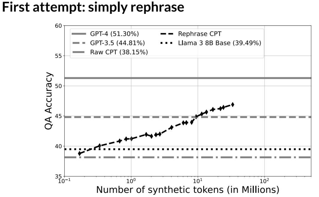 在这里的图表中, X 轴是我们在重写过程中生成的合成 token 的数量。在重写过程中,我们的提示词实际上就是:「这是一本书,你能像维基百科文章一样重写它吗」。我们有一组四个固定的提示词,并且我们迭代地将它们应用于本书。在这个过程中,我们可以看到虽然取得了一些成功,准确率有所提高,但斜率并不算陡峭,最终达到的最高点也不是很高。