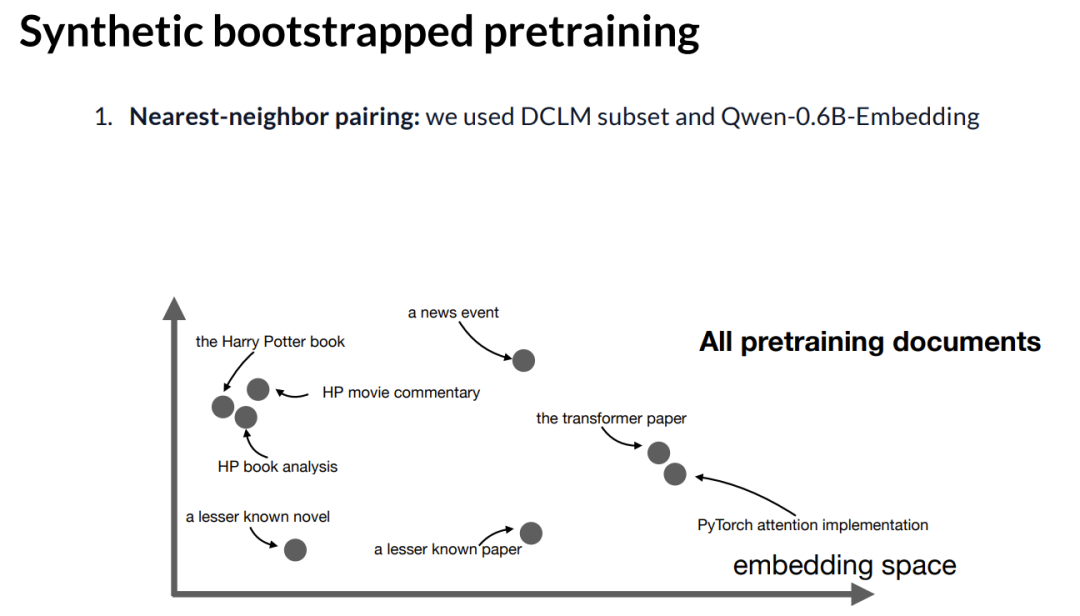 第一步,我们进行这种最近邻词向量编码计算。我们使用了 DCLM 数据集的一个子集,然后将其输入到 Qwen 6 的 embedding 模型中,我们就会得到类似这样的结果。这些词向量会对相似度进行编码。例如, Transformer 的论文将会在距离上非常靠近它的 PyTorch 实现代码。