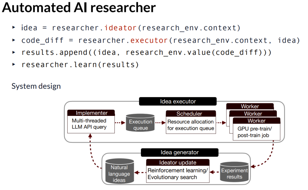 想象一下,这个「学习 API」有点像是在更新研究员的一些内在特质。对于这个「学习 API」或构思器的更新,可以采用强化学习的方法,这意味着将修改研究员内部神经网络的参数权重;它也可以像是一个演化搜索过程,维护一个类似实验结果清单的库。在本次演讲的范畴内,我将只聚焦于演化搜索的部分。