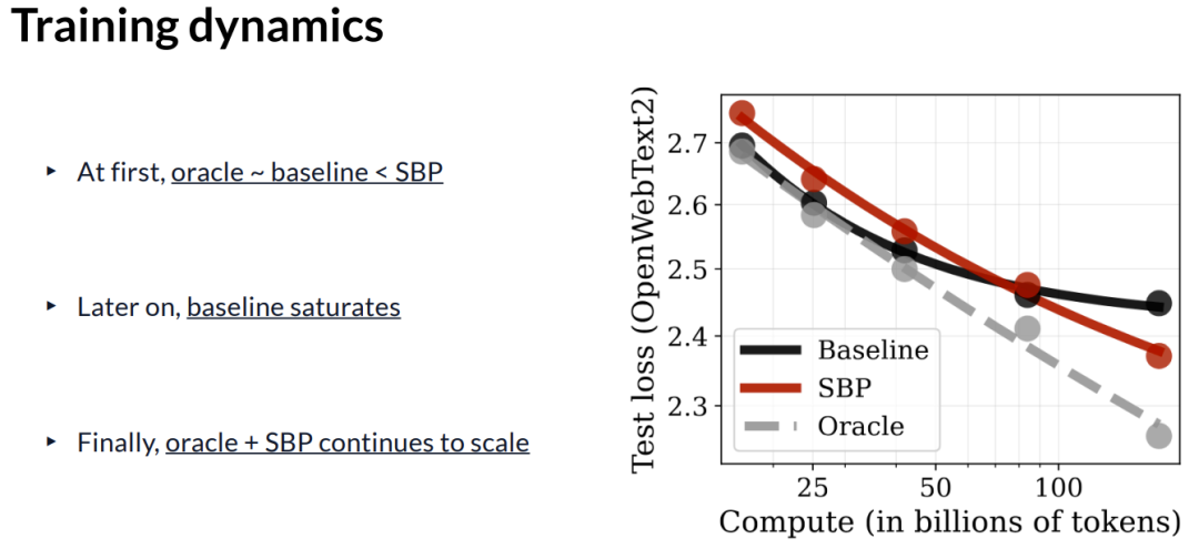其次,我们控制了训练的计算量,以确保整个过程的总训练周期是相同的。我在这里要强调的是,我们并没有控制总的绝对计算量,比如生成合成数据的所有推理成本等。从这个角度来看,合成引导预训练(SBPT)使用了更多的算力,我们仅仅是控制了预训练阶段的计算量。