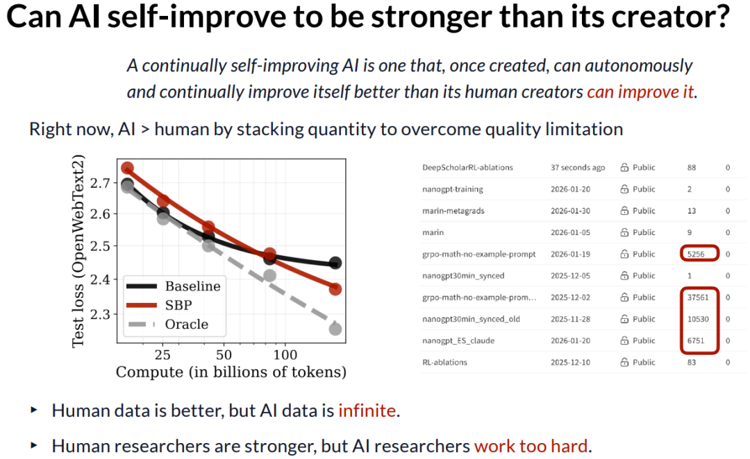 关于持续自我改进式 AI 的三个方面的主要结果就讲到这里。接下来,我想进入结语部分,内容可能稍微有点形而上。