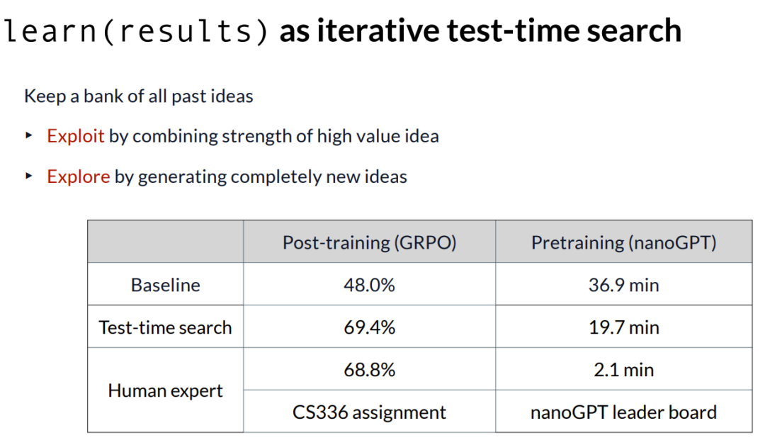 最后,他展示了「迈向 AI 设计 AI」的潜力,通过构建包含代码库和价值函数的独立研究环境,引入演化搜索机制,让模型自主提出算法思路、编写代码并运行实验。