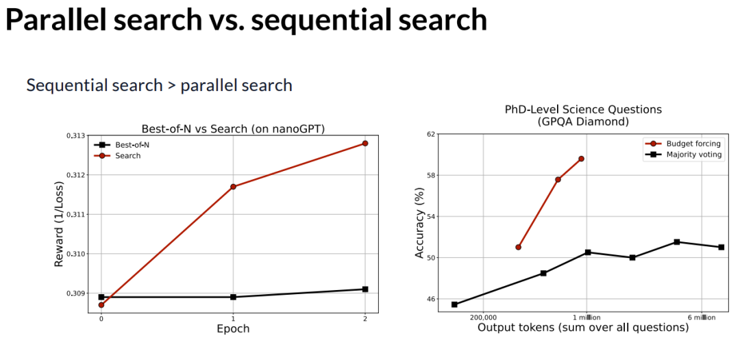 在左图中,这是在 nanoGPT 任务上的表现,最佳选择和多数投票并没有带来有意义的提升,但搜索方法却能带来持续一致的改进。这与推理任务中的情况十分相似:多数投票虽然有正的斜率,但提升不大,而串行搜索则大幅提高了这个斜率。