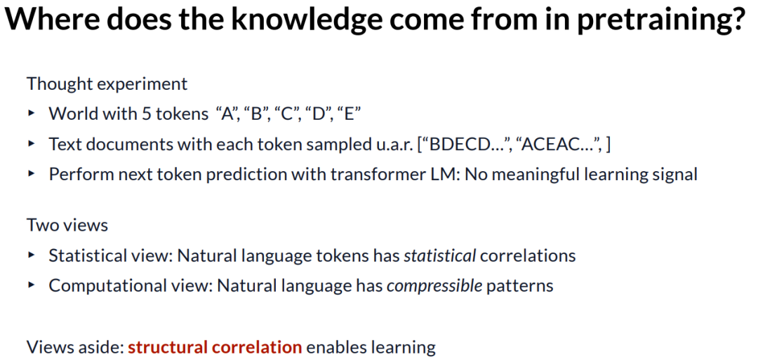 另一种更偏向计算层面的观点,即更接近香农最初提出的理论是,自然语言文本具有允许其被压缩的模式,而下一个 token 预测本质上是在进行信源编码以压缩文本。但抛开具体观点不谈,无论是统计学还是计算学的视角, token 之间确实存在使得模型能够学习的结构性相关性。
