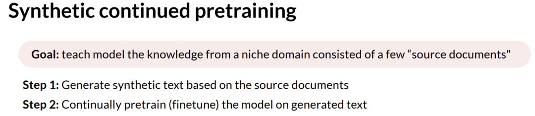 我们将要采用的技术是,希望通过合成数据等手段来利用这种跨文档的相关性。鉴于我们要使用合成数据,我们必须确保我们所看到的是预训练能力的普遍引导提升,而不仅仅是从教师模型中进行的知识蒸馏。 因此,我们会遵循以下三个步骤: