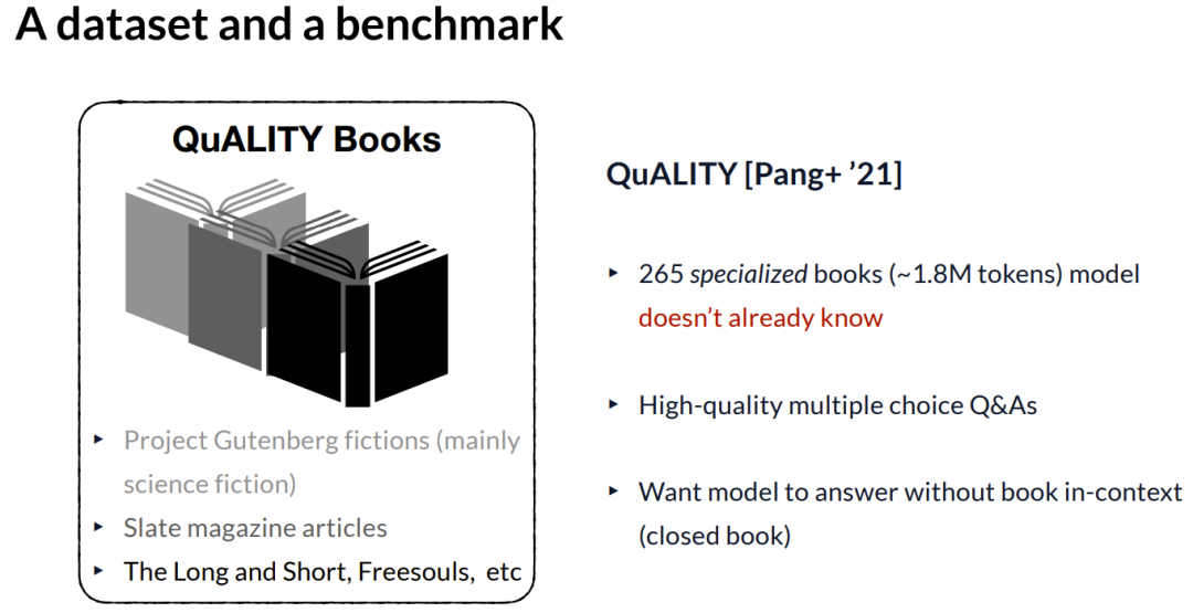 第二,我们需要一个任务来测试模型对这些源文档的了解程度,以便我们追踪进展。在本文中,我们使用了该团队构建的 QuALITY 数据集,它同时满足源文档和问答任务这两个标准。