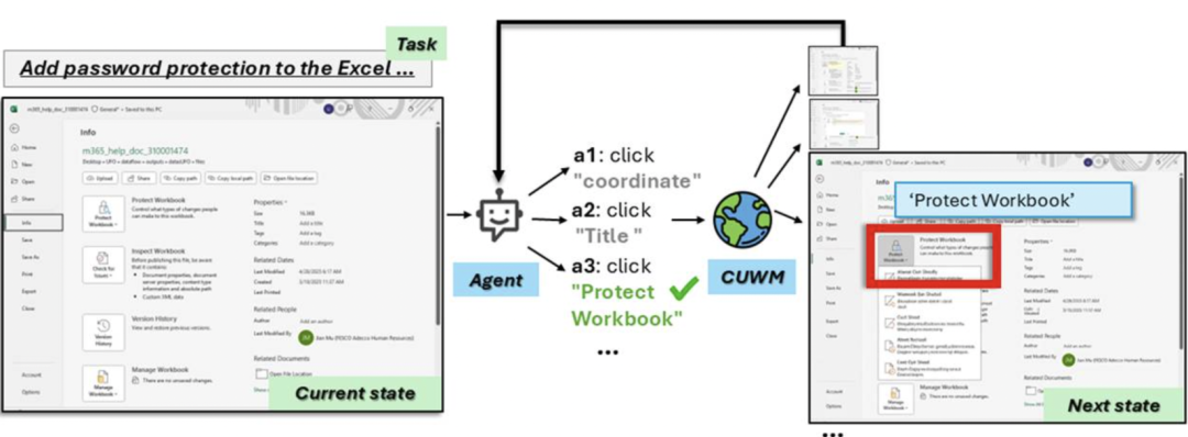 在实验中,智能体需要完成「给 Excel 工作簿添加密码保护」的任务。它不会立刻在真实环境里点来点去,而是先提出多个候选动作,并逐个调用 CUWM 进行模拟,得到每个动作可能带来的「下一步界面」。