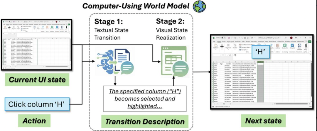 图 2:CUWM 概述:给定当前 UI 截图与动作(如点击 Excel 的列「H」),CUWM 先生成一段聚焦局部变化的过渡描述(Stage 1),再在保持不变区域稳定的前提下对截图进行条件编辑,生成预测的下一状态(Stage 2)。