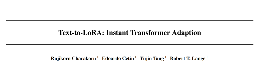 [2] Ryoo, M. S., Nguyen, T. T., & Ha, D. (2025). Text-to-LoRA: Zero-Shot Task Adaptation of Large Language Models via Hypernetworks. arXiv preprint arXiv:2506.06105v2.